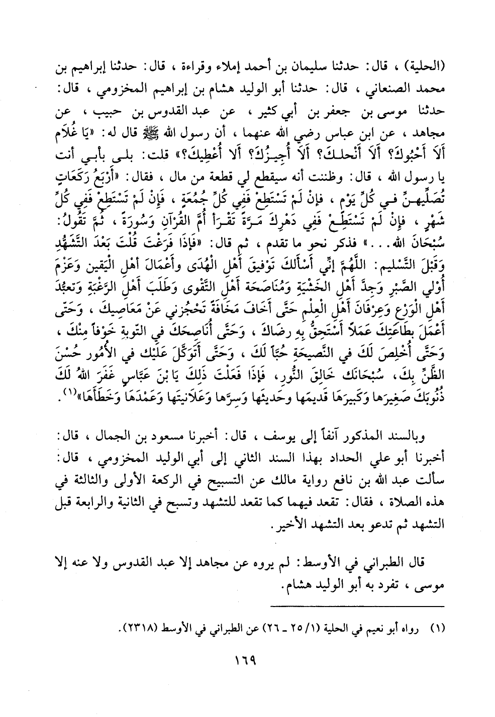 (الحلية)، قال: حدثنا سليمان بن أحمد إملاء وقراءة، قال: حدثنا إبراهيم بن محمد الصنعاني، قال: حدثنا أبو الوليد هشام بن إبراهيم المخزومي، قال: حدثنا موسى بن جعفر بن أبي كثير، عن عبد القدوس بن حبيب، عن مجاهد، عن ابن عباس رضي الله عنهما، أن رسول الله صلى الله عليه وسلم قال له: ((يا غلام ألا أحبوك؟ ألا أنحلك؟ ألا أجيزك؟ ألا أعطيك؟)) قلت: بلى بأبي أنت يا رسول الله، قال: وظننت أنه سيقطع لي قطعة من مال، فقال: ((أربع ركعات تصليهن في كل يومٍ، فإن لم تستطع ففي كل جمعةٍ، فإن لم تستطع ففي كل شهرٍ، فإن لم تستطع ففي دهرك مرةً تقرأ أم القرآن وسورة، ثم تقول: سبحان الله .. .. )) فذكر نحو ما تقدم، ثم قال: ((فإذا فرغت قلت بعد التشهد وقبل التسليم: اللهم إني أسألك توفيق أهل الهدى وأعمال أهل اليقين وعزم أول الصبر وجد أهل الخشية ومناصحة أهل التقوى وطلب أهل الرغبة وتعبد أهل الورع وعرفان أهل العلم حتى أخاف مخافة تحجزني عن معاصيك، وحتى أعمل بطاعتك عملاً أستحق به رضاك، وحتى أناصحك في التوبة خوفاً منك، وحتى أخلص لك في النصيحة حباً لك، وحتى أتوكل عليك في الأمور حسن الظن بك، سبحانك خالق النور، فإذا فعلت ذلك يا ابن عباس غفر الله لك ذنوبك صغيرها وكبيرها قديمها وحديثها وسرها وعلانيتها وعمدها وخطأها)).