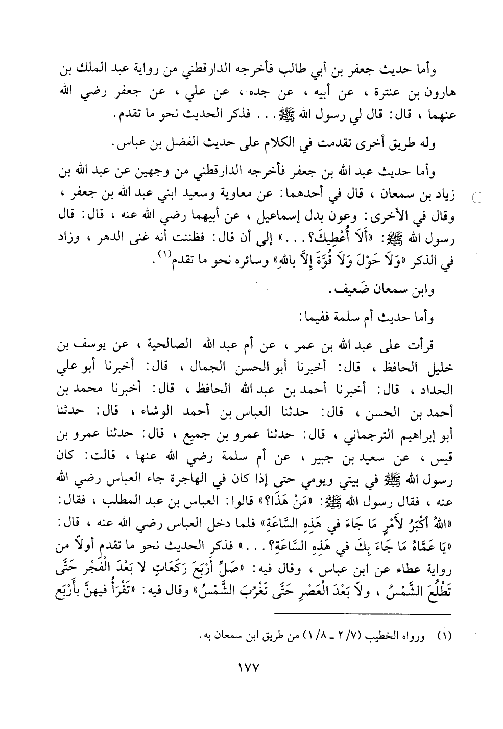 وأما حديث عبد الله بن جعفر فأخرجه الدارقطني من وجهين عن عبد الله بن زياد بن سمعان، قال في أحدهما: عن معاوية وسعيد ابني عبد الله بن جعفر، وقال في الأخرى: وعون بدل إسماعيل، عن أبيهما رضي الله عنه، قال: قال رسول الله صلى الله عليه وسلم: ((ألا أعطيك؟ ..)) إلى أن قال: فظننت أنه غنى الدهر، وزاد في الذكر ((ولا حول ولا قوة إلا بالله)) وسائره نحو ما تقدم.