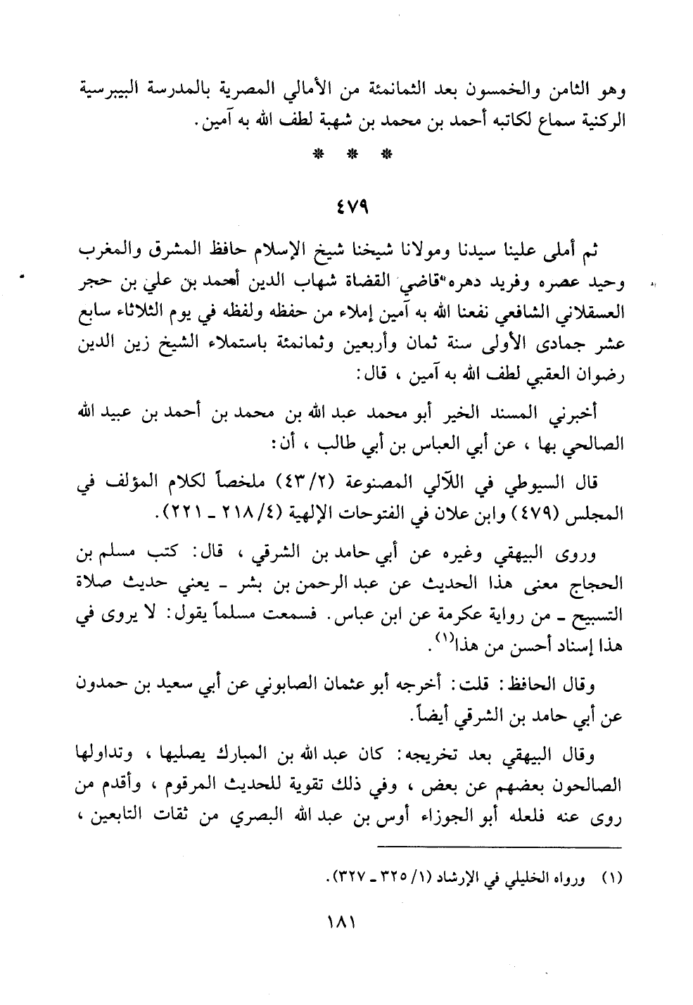 ثم أملى علينا سيدنا ومولانا شيخنا شيخ الإسلام حافظ المشرق والمغرب وحيد عصره وفريد دهره قاضي القضاة شهاب الدين أحمد بن علي بن حجر العسقلاني الشافعي نفعنا الله به آمين إملاء من حفظه ولفظه في يوم الثلاثاء سابع عشر جمادى الأولى سنة ثمان وأربعين وثمانمئة باستملاء الشيخ زين الدين رضوان العقبي لطف الله به آمين، قال: