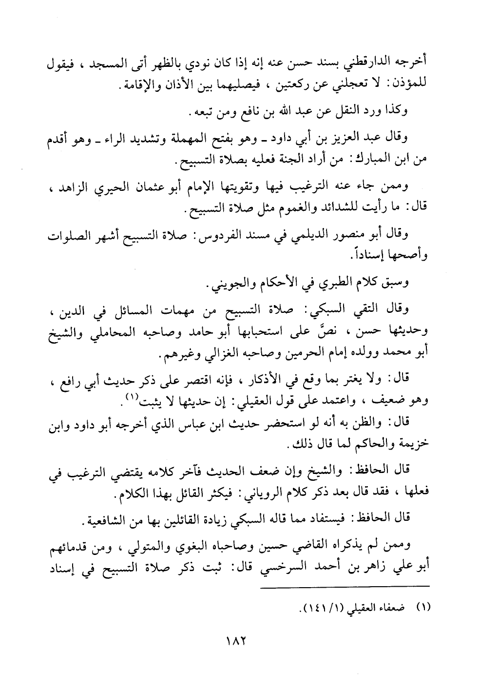وقال التقي السبكي: صلاة التسبيح من مهمات المسائل في الدين، وحديثها حسن، نص على استحبابها أبو حامد وصاحبه المحاملي والشيخ أبو محمد وولده إمام الحرمين وصاحبه الغزالي وغيرهم.