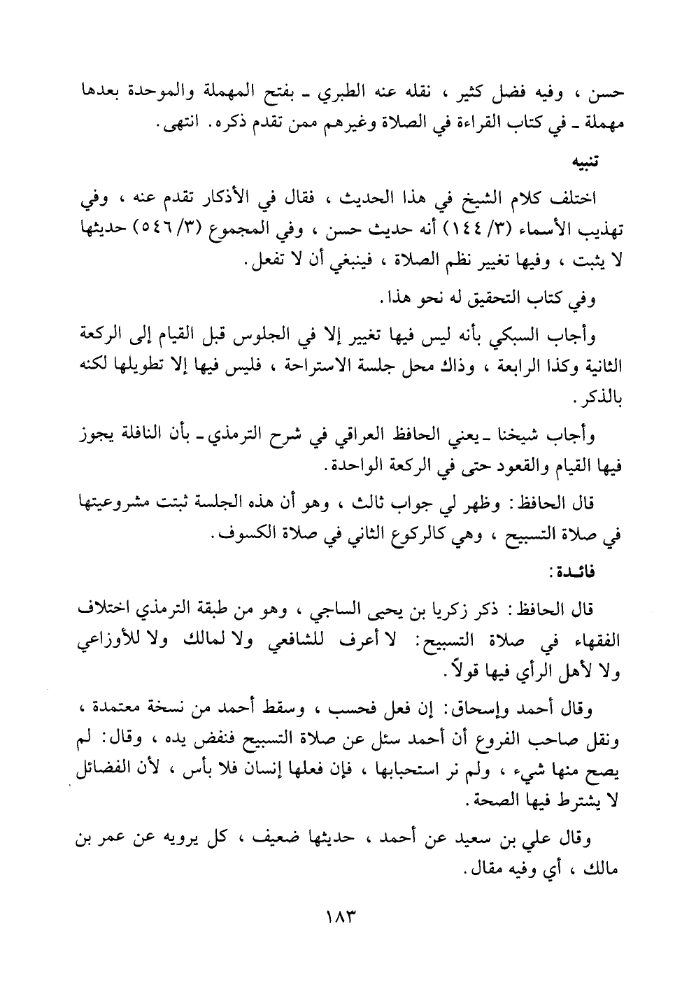 وقال أحمد وإسحاق: إن فعل فحسب، وسقط أحمد من نسخة معتمدة، ونقل صاحب الفروع أن أحمد سئل عن صلاة التسبيح فنفض يده، وقال: لم يصح منها شيء، ولم نر استحبابها، فإن فعلها إنسان فلا بأس، لأن الفضائل لا يشترط فيها الصحة.