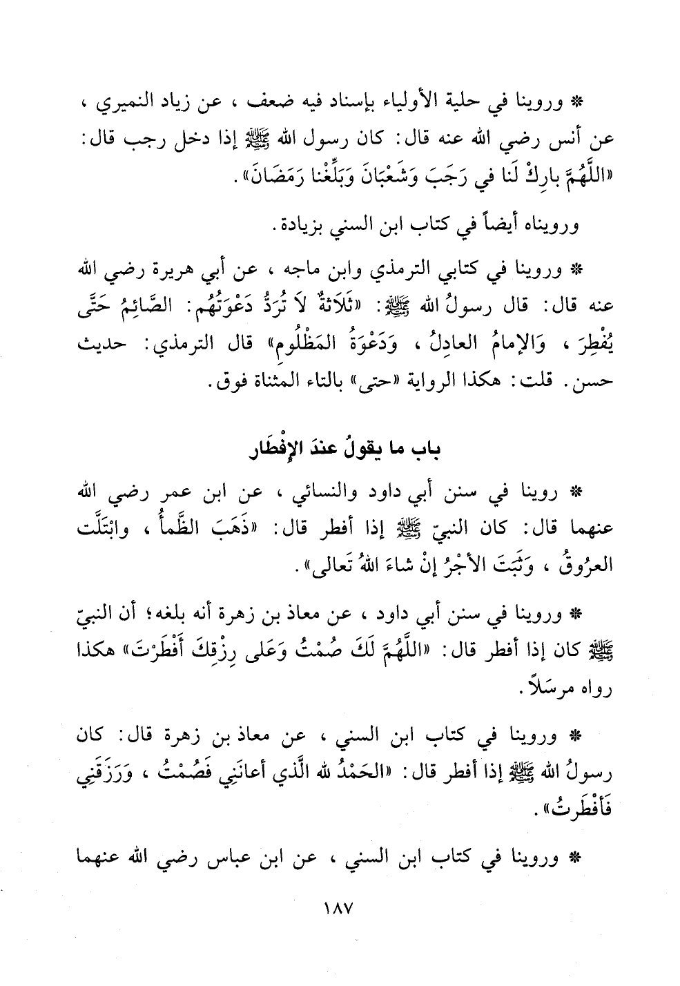 روينا في سنن أبي داود والنسائي، عن ابن عمر رضي الله عنهما قال: كان النبي صلى الله عليه وسلم إذا أفطر قال: ((ذهب الظمأ، وابتلت العروق، وثبت الأجر إن شاء الله تعالى)).