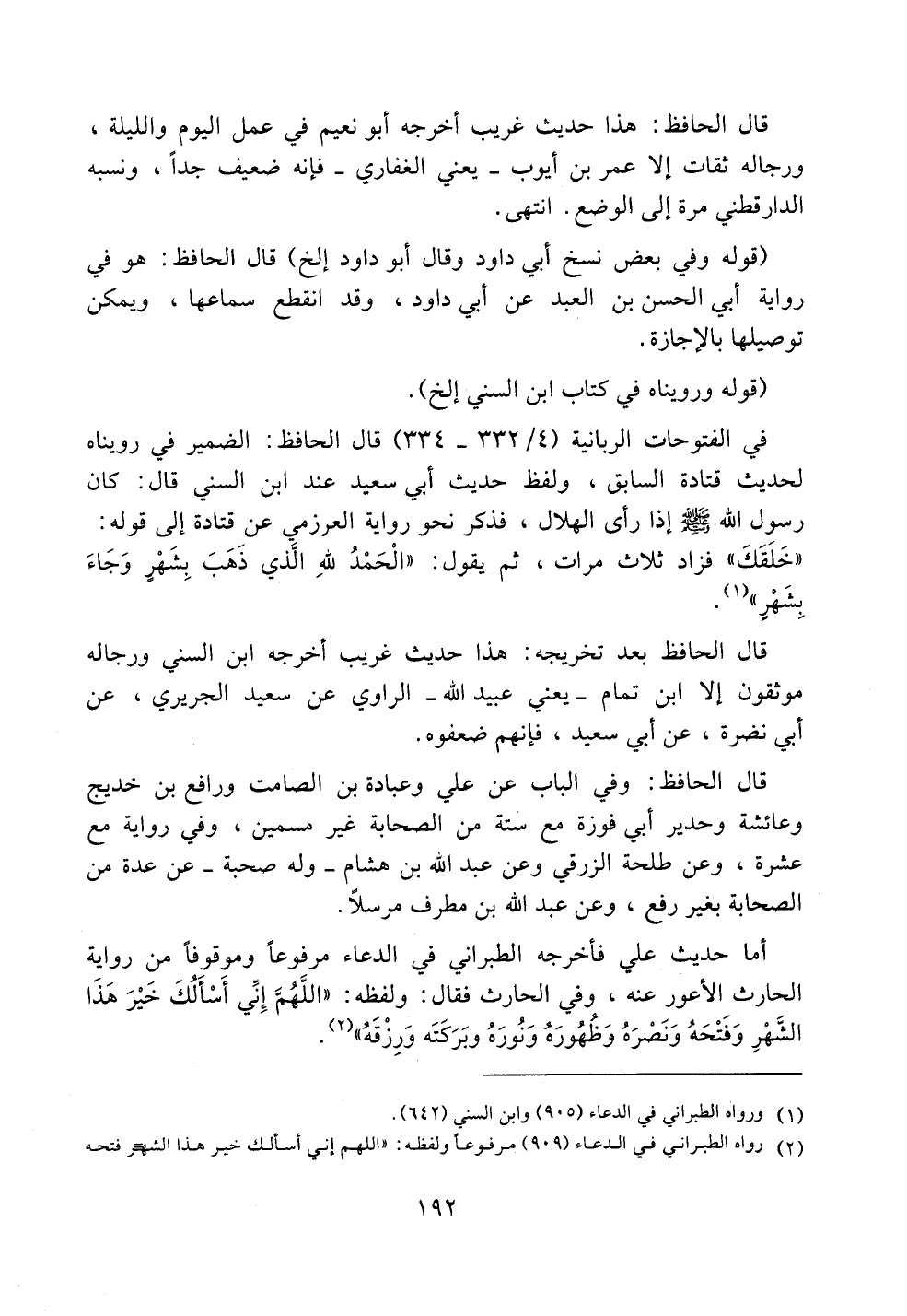 في الفتوحات الربانية (4/332-334) قال الحافظ: الضمير في رويناه لحديث قتادة السابق، ولفظ حديث أبي سعيد عند ابن السني قال: كان رسول الله صلى الله عليه وسلم إذا رأى الهلال، فذكر نحو رواية العرزمي عن قتادة إلى قوله: ((خلقك)) فزاد ثلاث مرات، ثم يقول: ((الحمد لله الذي ذهب بشهرٍ وجاء بشهرٍ)).