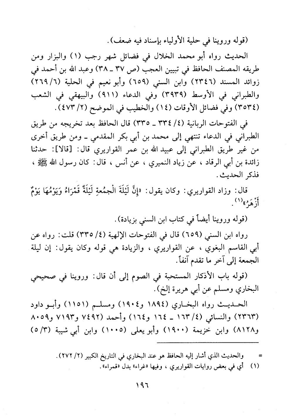 قال: وزاد القواريري: وكان يقول: ((إن ليلة الجمعة ليلةٌ قمراء ويومها يوم أزهر)).