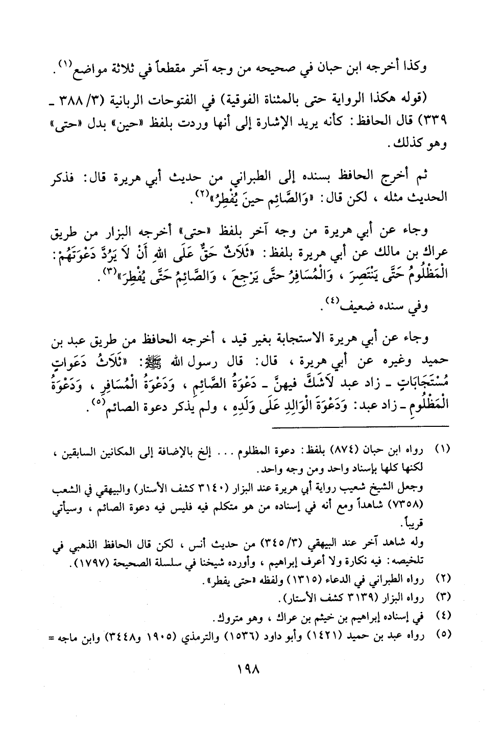وجاء عن أبي هريرة من وجه آخر بلفظ ((حتى)) أخرجه البزار من طريق عراك بن مالك عن أبي هريرة بلفظ: ((ثلاثٌ حق على الله أن لا يرد دعوتهم: المظلوم حتى ينتصر، والمسافر حتى يرجع، والصائم حتى يفطر)).