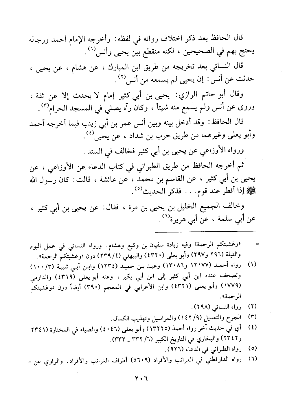 وقال أبو حاتم الرازي: يحيى بن أبي كثير إمام لا يحدث إلا عن ثقة، وروى عن أنس ولم يسمع منه شيئاً، وكان رآه يصلي في المسجد الحرام.