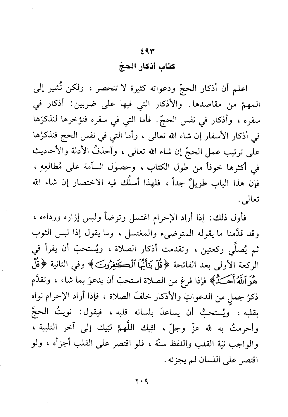 اعلم أن أذكار الحج ودعواته كثيرة لا تنحصر، ولكن نشير إلى المبهم من مقاصدها. والأذكار التي فيها على ضربين: أذكار في سفره، وأذكار في نفس الحج. فأما التي في سفره فنؤخرها لنذكرها في أذكار الأسفار إن شاء الله تعالى، وأما التي في نفس الحج فنذكرها على ترتيب عمل الحج إن شاء الله تعالى، وأحذف الأدلة والأحاديث في أكثرها خوفاً من طول الكتاب، وحصول السآمة على مطالعه، فإن هذا الباب طويلٌ جداً، فلهذا أسلك فيه الاختصار إن شاء الله تعالى.