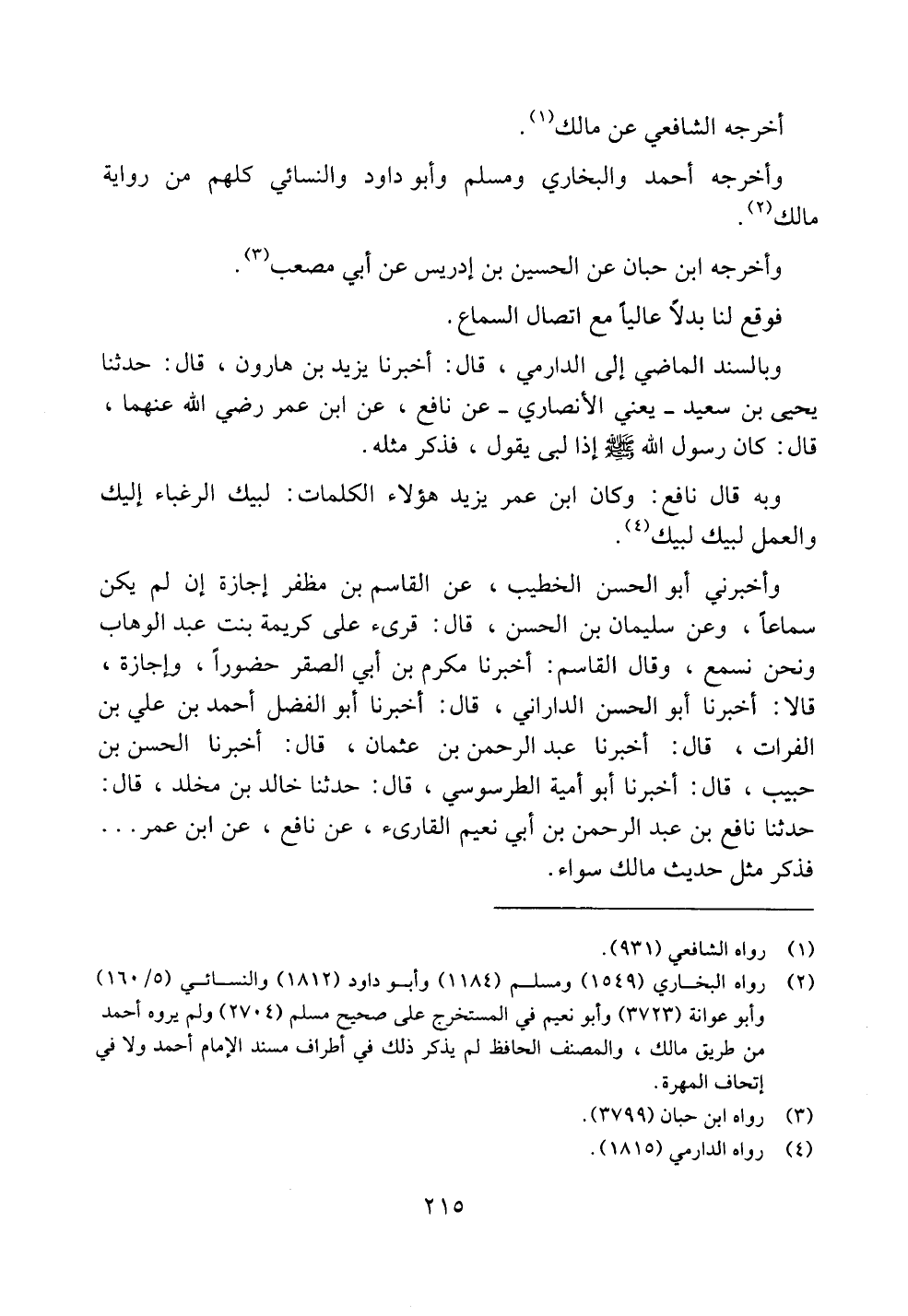 وبالسند الماضي إلى الدارمي، قال: أخبرنا يزيد بن هارون، قال: حدثنا يحيى بن سعيد -يعني الأنصاري- عن نافع، عن ابن عمر رضي الله عنهما، قال: كان رسول الله صلى الله عليه وسلم إذا لبى يقول، فذكر مثله.
