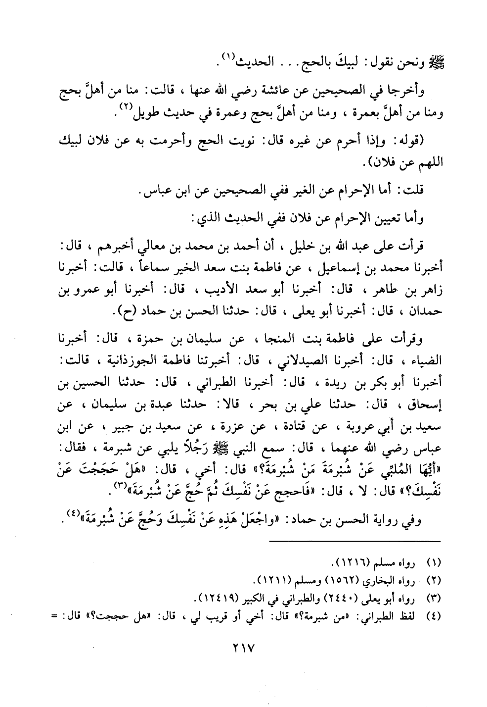 وقرأت على فاطمة بنت المنجا، عن سليمان بن حمزة، قال: أخبرنا الضياء، قال: أخبرنا الصيدلاني، قال: أخبرتنا فاطمة الجوزذانية، قالت: أخبرنا أبو بكر بن ريدة، قال: أخبرنا الطبراني، قال: حدثنا الحسين بن إسحاق، قال: حدثنا علي بن بحر، قالا: حدثنا عبدة بن سليمان، عن سعيد بن أبي عروبة، عن قتادة، عن عزرة، عن سعيد بن جبير، عن ابن عباس رضي الله عنهما، قال: سمع النبي صلى الله عليه وسلم رجلاً يلبي عن شبرمة، فقال: ((أيها الملبي عن شبرمة من شبرمة؟)) قال: أخي، قال: ((هل حججت عن نفسك؟)) قال: لا، قال: ((فاحجج عن نفسك ثم حج عن شبرمة)).