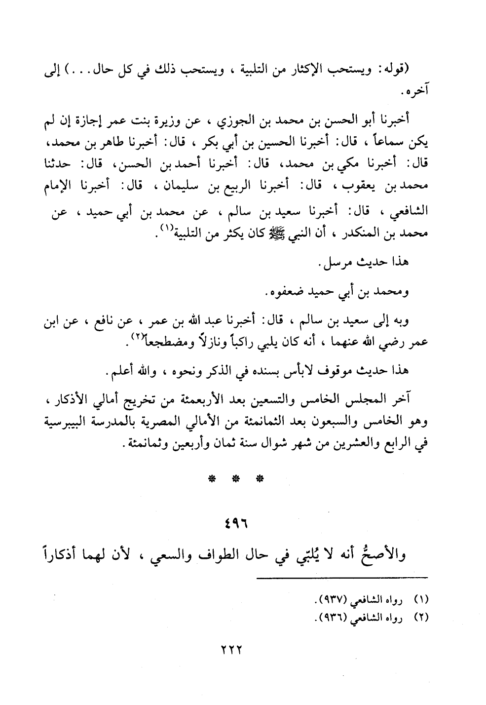 أخبرنا أبو الحسن بن محمد بن الجوزي، عن وزيرة بنت عمر إجازة إن لم يكن سماعاً، قال: أخبرنا الحسين بن أبي بكر، قال: أخبرنا طاهر بن محمد، قال: أخبرنا مكي بن محمد، قال: أخبرنا أحمد بن الحسن، قال: حدثنا محمد بن يعقوب، قال: أخبرنا الربيع بن سليمان، قال: أخبرنا الإمام الشافعي، قال: أخبرنا سعيد بن سالم، عن محمد بن أبي حميد، عن محمد بن المنكدر، أن النبي صلى الله عليه وسلم كان يكثر من التلبية.