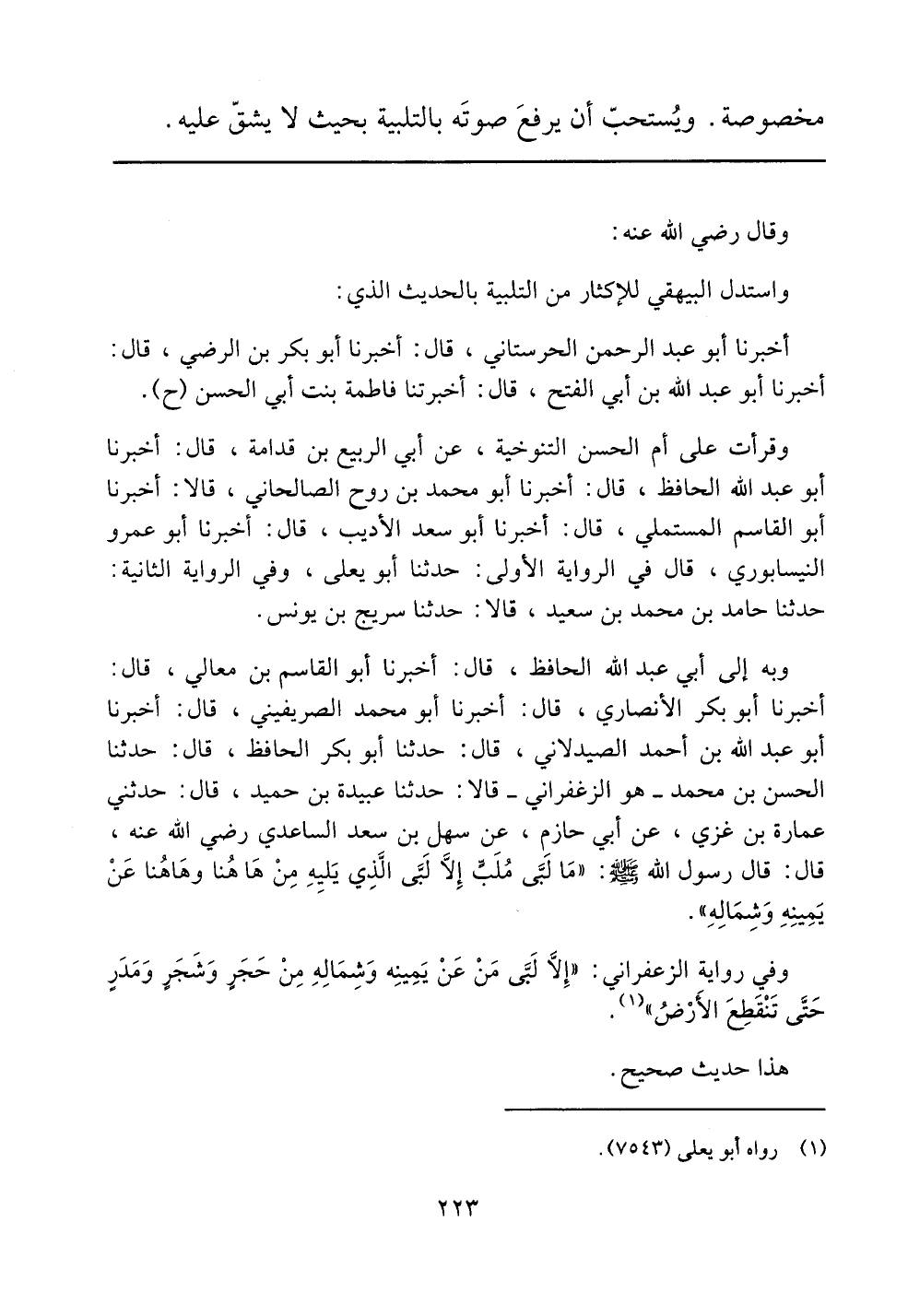 واستدل البيهقي للإكثار من التلبية بالحديث الذي: