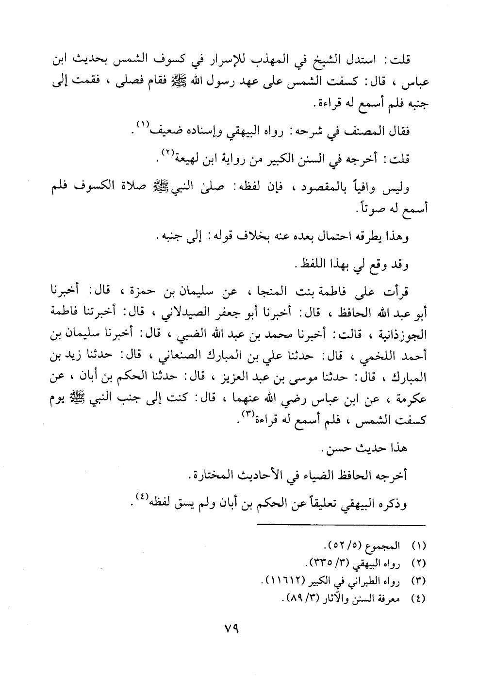 قلت: استدل الشيخ في المهذب للإسرار في كسوف الشمس بحديث ابن عباس، قال: كسفت الشمس على عهد رسول الله صلى الله عليه وسلم فقام فصلى، فقمت إلى جنبه فلم أسمع له قراءة.