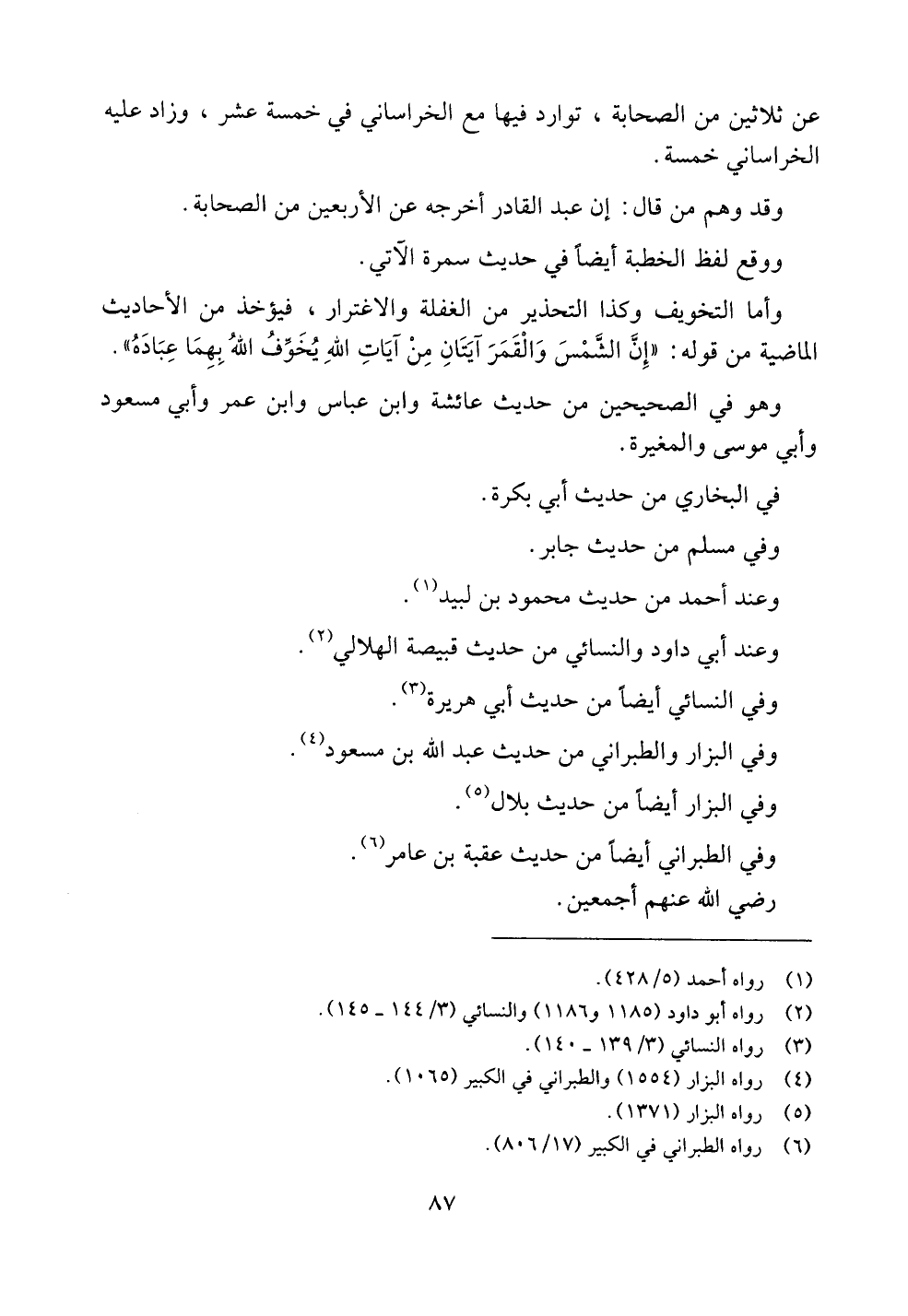 وأما التخويف وكذا التحذير من الغفلة والاغترار، فيؤخذ من الأحاديث الماضية من قوله: ((إن الشمس والقمر آيتان من آيات الله يخوف الله بهما عباده)).
