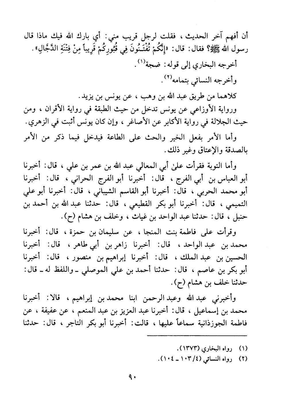وأما التوبة فقرأت على أبي المعالي عبد الله بن عمر بن علي، قال: أخبرنا أبو العباس بن أبي الفرج، قال: أخبرنا أبو الفرج الحراني، قال: أخبرنا أبو محمد الحربي، قال: أخبرنا أبو القاسم الشيباني، قال: أخبرنا أبو علي التميمي، قال: أخبرنا أبو بكر القطيعي، قال: حدثنا عبد الله بن أحمد بن حنبل، قال: حدثنا عبد الواحد بن غياث، وخلف بن هشام (ح).