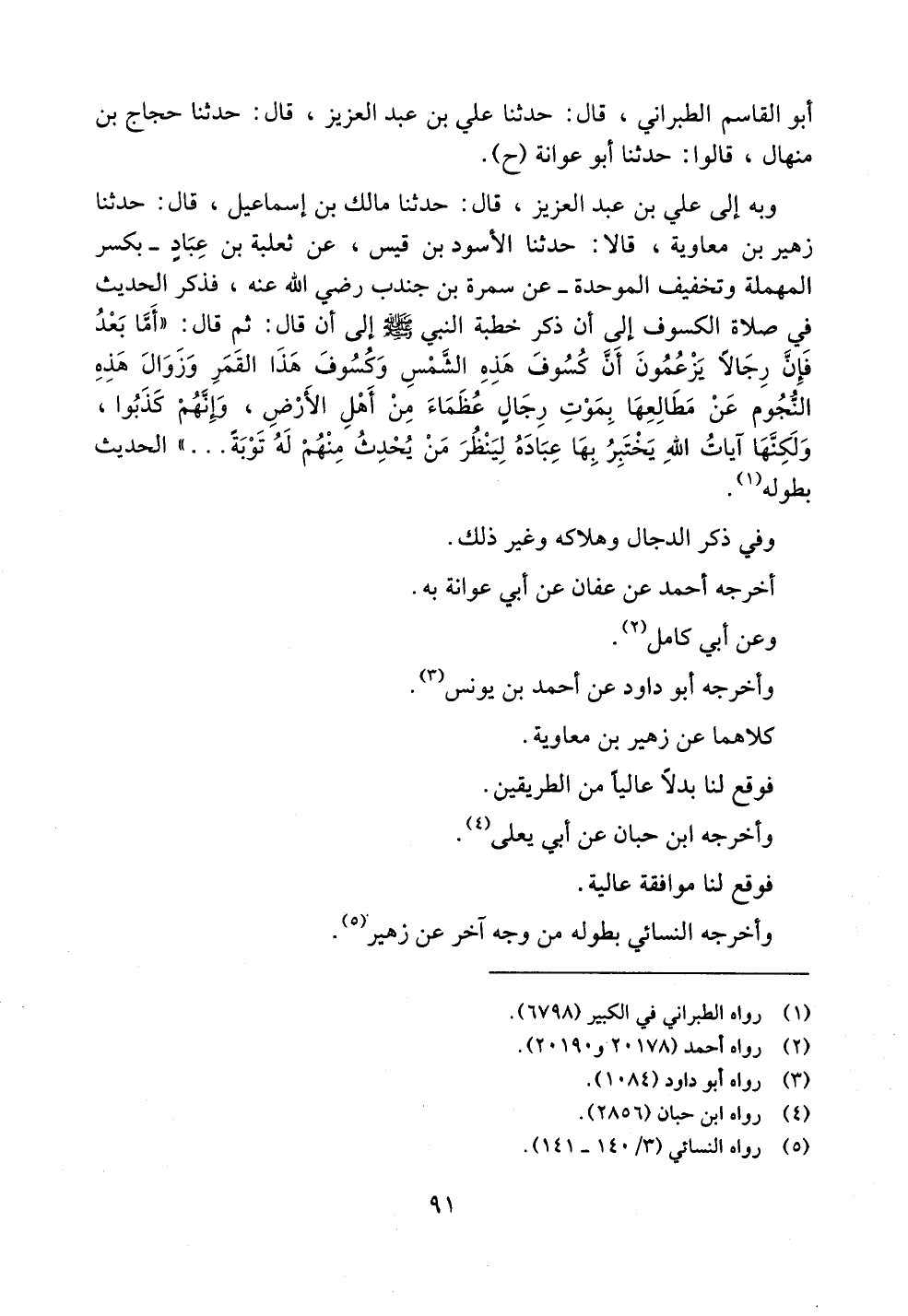 وبه إلى علي بن عبد العزيز، قال: حدثنا مالك بن إسماعيل، قال: حدثنا زهير بن معاوية، قالا: حدثنا الأسود بن قيس، عن ثعلبة بن عبادٍ -بكسر المهملة وتخفيف الموحدة- عن سمرة بن جندب رضي الله عنه، فذكر الحديث في صلاة الكسوف إلى أن ذكر خطبة النبي صلى الله عليه وسلم إلى أن قال: ثم قال: ((أما بعد فإن رجالاً يزعمون أن كسوف هذه الشمس وكسوف هذا القمر وزوال هذه النجوم عن مطالعها بموت رجالٍ عظماء من أهل الأرض، وإنهم كذبوا، ولكنها آيات الله يختبر بها عباده لينظر من يحدث منهم له توبةً .. .. )) الحديث بطوله.