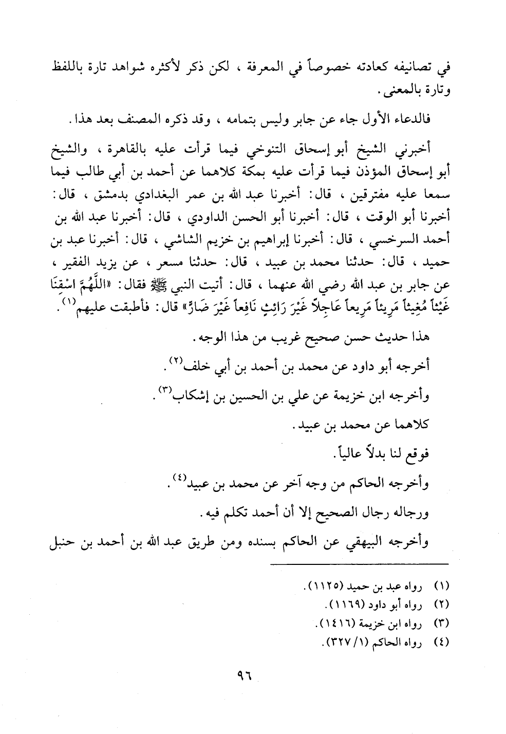 أخبرني الشيخ أبو إسحاق التنوخي فيما قرأت عليه بالقاهرة، والشيخ أبو إسحاق المؤذن فيما قرأت عليه بمكة كلاهما عن أحمد بن أبي طالب فيما سمعا عليه مفترقين، قال: أخبرنا عبد الله بن عمر البغدادي بدمشق، قال: أخبرنا أبو الوقت، قال: أخبرنا أبو الحسن الداودي، قال: أخبرنا عبد الله بن أحمد السرخسي، قال: أخبرنا إبراهيم بن خزيم الشاشي، قال: أخبرنا عبد بن حميد، قال: حدثنا محمد بن عبيد، قال: حدثنا مسعر، عن يزيد الفقير، عن جابر بن عبد الله رضي الله عنهما، قال: أتيت النبي صلى الله عليه وسلم فقال: ((اللهم اسقنا غيثاً مغيثاً مريئاً مريعاً عاجلاً غير رائثٍ نافعاً غير ضار)) قال: فأطبقت عليهم.