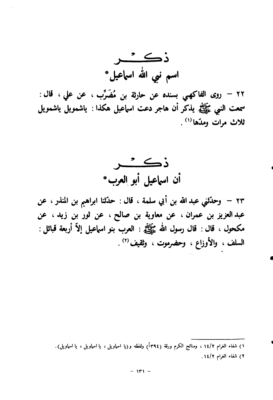 54 - وَذكر الفاكهي خَبرا يَقْتَضِي أَن عَمْرو بن لحي أول مُلُوك خُزَاعَة وَفِيه ذكر شَيْء من خَبره وَخبر جرهم لِأَنَّهُ قَالَ وَيُقَال فِي رِوَايَة أبي عَمْرو الشَّيْبَانِيّ إِن حجابة الْبَيْت صَارَت إِلَى خُزَاعَة لِأَن ربيعَة بن حَارِثَة بن امرىء الْقَيْس بن ثَعْلَبَة بن مَازِن تزوج فهَيْرَة بنت الْحَارِث بن مضاض الجرهمي فَولدت لَهُ عَمْرو بن ربيعَة فَلَمَّا شب عَمْرو وساد وَشرف طلب حجابة الْبَيْت فَعِنْدَ ذَلِك نشبت الْحَرْب بَينهم وَبَين جرهم وَذكروا أَن عَمْرو بن ربيعَة عَاشَ ثَلَاثمِائَة وخمسا وَأَرْبَعين سنة وَبلغ وَلَده فِي حَيَاته ألف مقَاتل من ولد كَعْب وعدي وَسعد ومليح وعَوْف بن عَمْرو وَكَانَت بَينهم حروب طَوِيلَة وقتال شَدِيد ثمَّ إِن خُزَاعَة غلبوا جرهما على الْبَيْت وَخرجت جرهم حَتَّى نزلت وَادي إضم فهلكوا فِيهِ وَكَانَ عَمْرو بن ربيعَة أول من غير دين ابراهيم عَلَيْهِ السَّلَام وَأَنه خرج إِلَى الشَّام فاستخلف على الْبَيْت رجلا من بني عبد بن ضخم يُقَال لَهُ آكل الْمَرْوَة وَعَمْرو يَوْمئِذٍ وَأهل مَكَّة على دين ابراهيم عَلَيْهِ السَّلَام فَلَمَّا قدم الشَّام نزل البلقاء فَوجدَ قوما يعْبدُونَ أوثانا فَقَالَ مَا هَذِه الأنصاب الَّتِي أَرَاكُم تَعْبدُونَ فَقَالُوا أَرْبَابًا نتخذها نستنصر بهَا على عدونا فننصر ونستشفي بهَا من الْمَرَض فنشفى فَوَقع قَوْلهم فِي نَفسه فَقَالَ هبوا لي مِنْهَا وَاحِدًا نتخذه ببلدي فَإِنِّي صَاحب بَيت الله الْحَرَام وَالِي وفدت الْعَرَب من كل صوب فَأَعْطوهُ صنما يُقَال لَهُ هُبل فَحَمله حَتَّى نَصبه للنَّاس بِمَكَّة فتابعه الْعَرَب على ذَلِك. وَذكر بَقِيَّة الْخَبَر