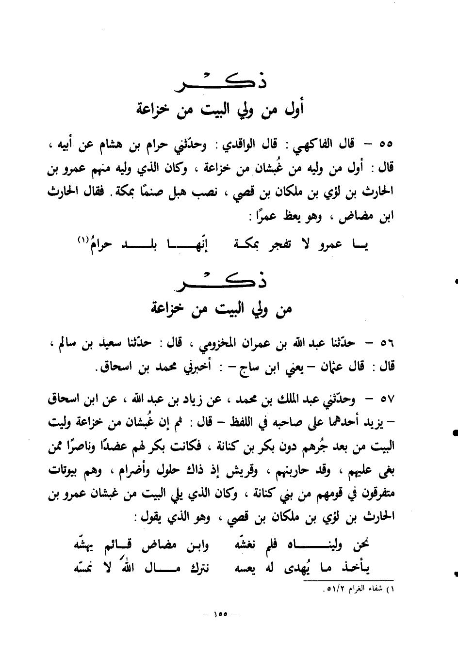 93 - وَحدثنَا الزبير بن أبي بكر قَالَ قَالَ أَبُو الْحسن الْأَثْرَم قَالَ أَبُو عُبَيْدَة قَالَ مُحَمَّد بن حَفْص قدم رزاح وَقد نفى قصي خُزَاعَة وَقَالَ