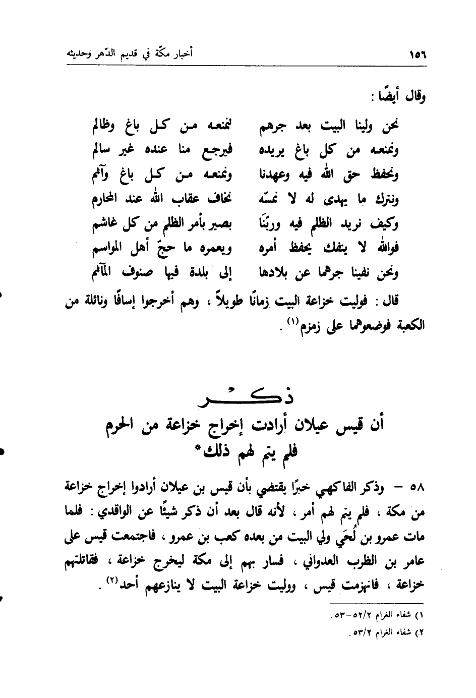 95 - روى الفاكهي بِسَنَدِهِ إِلَى كَرَامَة بن الْمِقْدَاد بن عَمْرو الْكِنْدِيّ عَن أَبِيهَا الْمَعْرُوف بالمقداد بن الْأسود أَن قصيا اشْترى مَفَاتِيح الْكَعْبَة من أبي غبشان بزق خمر