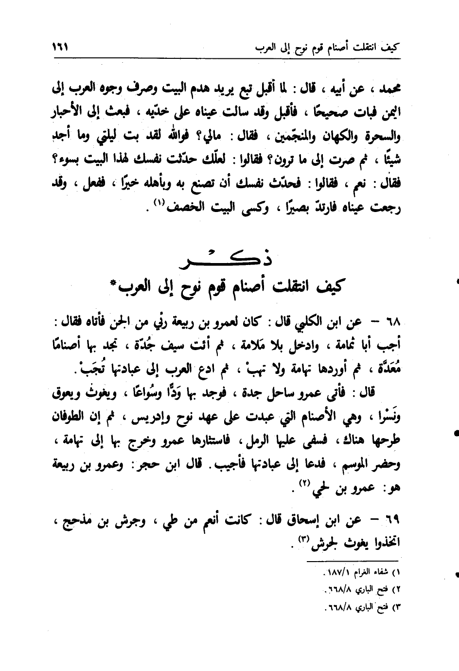 106 - وَقَالَ الفاكهي وَحدثنَا الزبير بن أبي بكر قَالَ حَدثنِي عمر بن أبي بكر الْموصِلِي عَن زَكَرِيَّا بن عِيسَى عَن ابْن شهَاب أَنَّهُمَا كَانَا حلفين اثْنَيْنِ فَأَما حلف قُرَيْش الأول فَإِن بني كلاب تكثروا على بطُون بني كَعْب ابْن لؤَي فتحالفت عَلَيْهِم تِلْكَ الأحلاف مَخْزُوم وعدي وَسَهْم وجمح فَانْطَلق المطيبون وَكَانَ حلفهم أَن جعلُوا جَفْنَة من طيب فتطيبوا بهَا فسموا المطيبين بذلك الطّيب فِي الْجَفْنَة وَسميت الأحلاف بتحالفهم عَلَيْهِ أَن جعلُوا جَفْنَة فِيهَا دم فغمسوا أَيْديهم فِيهَا زَاد الزبير بن أبي بكر فِي حَدِيثه وَأَن الأحلاف عبوا لكل قَبيلَة قَبيلَة وأنكروا شَأْن بني عبد الدَّار وولايتهم الْكَعْبَة واللواء والندوة فَقَالُوا مَا شَأْن هَؤُلَاءِ إِخْوَاننَا يلون علينا هَذَا وهم قَلِيل لننزعنه من أَيْديهم وَأَنَّهُمْ عَمدُوا إِلَى مِفْتَاح الْكَعْبَة فَأَخَذُوهُ من عُثْمَان بن عبد الدَّار وَبَينه وَأَن بني عبد الدَّار أضافوا إِلَى الأحلاف فحالفوهم فشدوا الْحلف بَينهم وَأَن الأحلاف لكل قَبيلَة فَبعث بَنو سهم لبني عبد منَاف (اه) بِاخْتِصَار