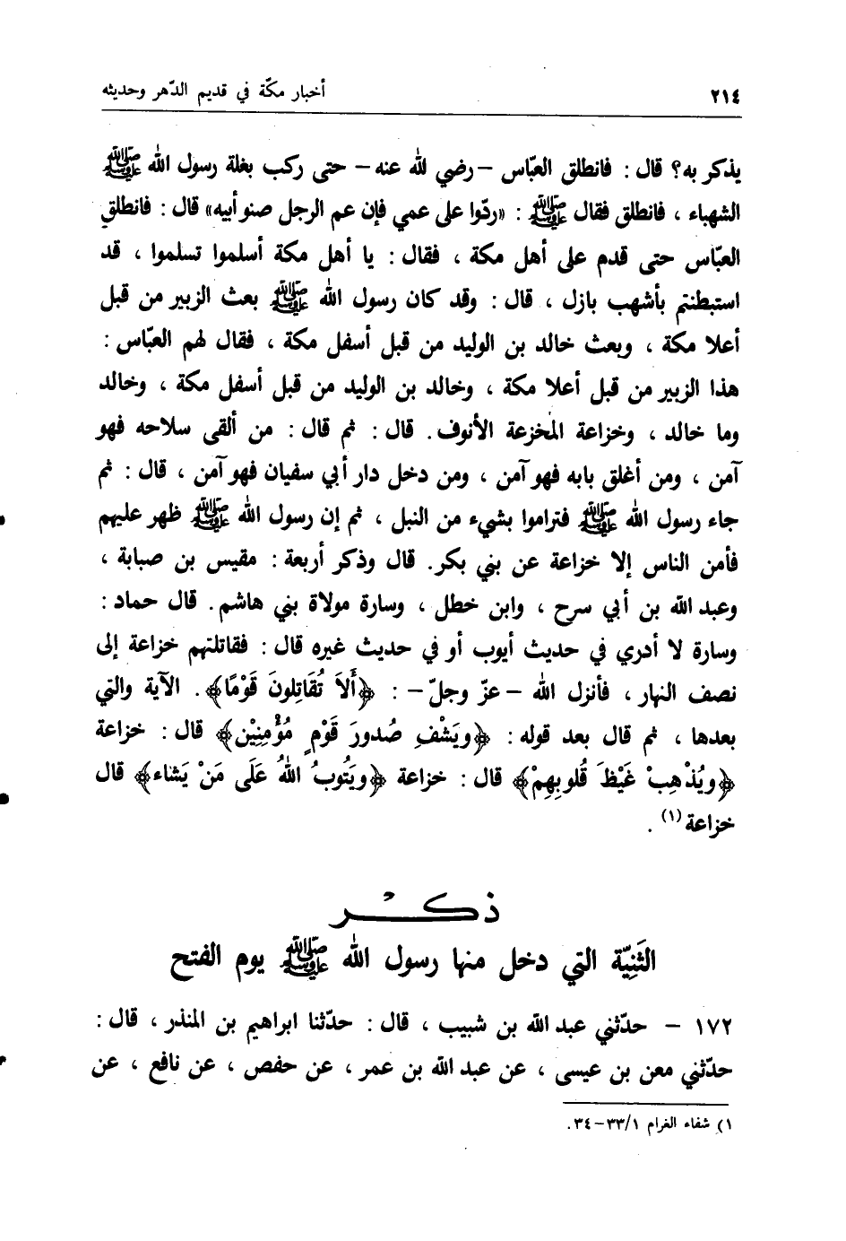 206 - وَذكر الفاكهي أَنه شَاهد هَذَا الْبَاب المسدود من دَاخل الْكَعْبَة فِي سنة ثَلَاث وَسِتِّينَ وَمِائَتَيْنِ فَإِذا هُوَ مُقَابل بَاب الْكَعْبَة وَهُوَ بِقَدرِهِ فِي الطول وَالْعرض وَإِذا فِي أَعْلَاهُ كلاليب ثَلَاثَة كَمَا فِي الْبَاب الْمَوْجُود سَوَاء