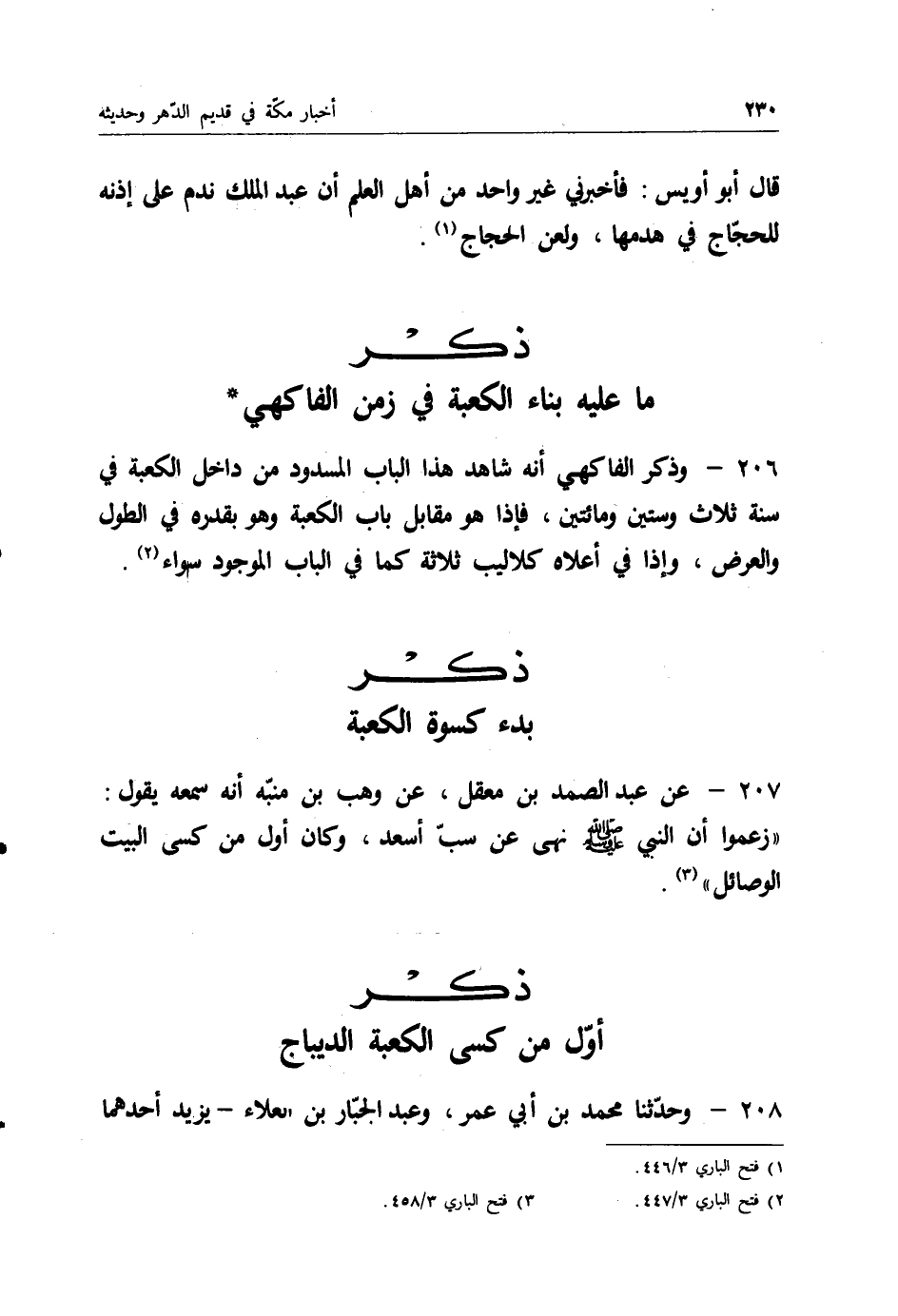 206 - وَذكر الفاكهي أَنه شَاهد هَذَا الْبَاب المسدود من دَاخل الْكَعْبَة فِي سنة ثَلَاث وَسِتِّينَ وَمِائَتَيْنِ فَإِذا هُوَ مُقَابل بَاب الْكَعْبَة وَهُوَ بِقَدرِهِ فِي الطول وَالْعرض وَإِذا فِي أَعْلَاهُ كلاليب ثَلَاثَة كَمَا فِي الْبَاب الْمَوْجُود سَوَاء