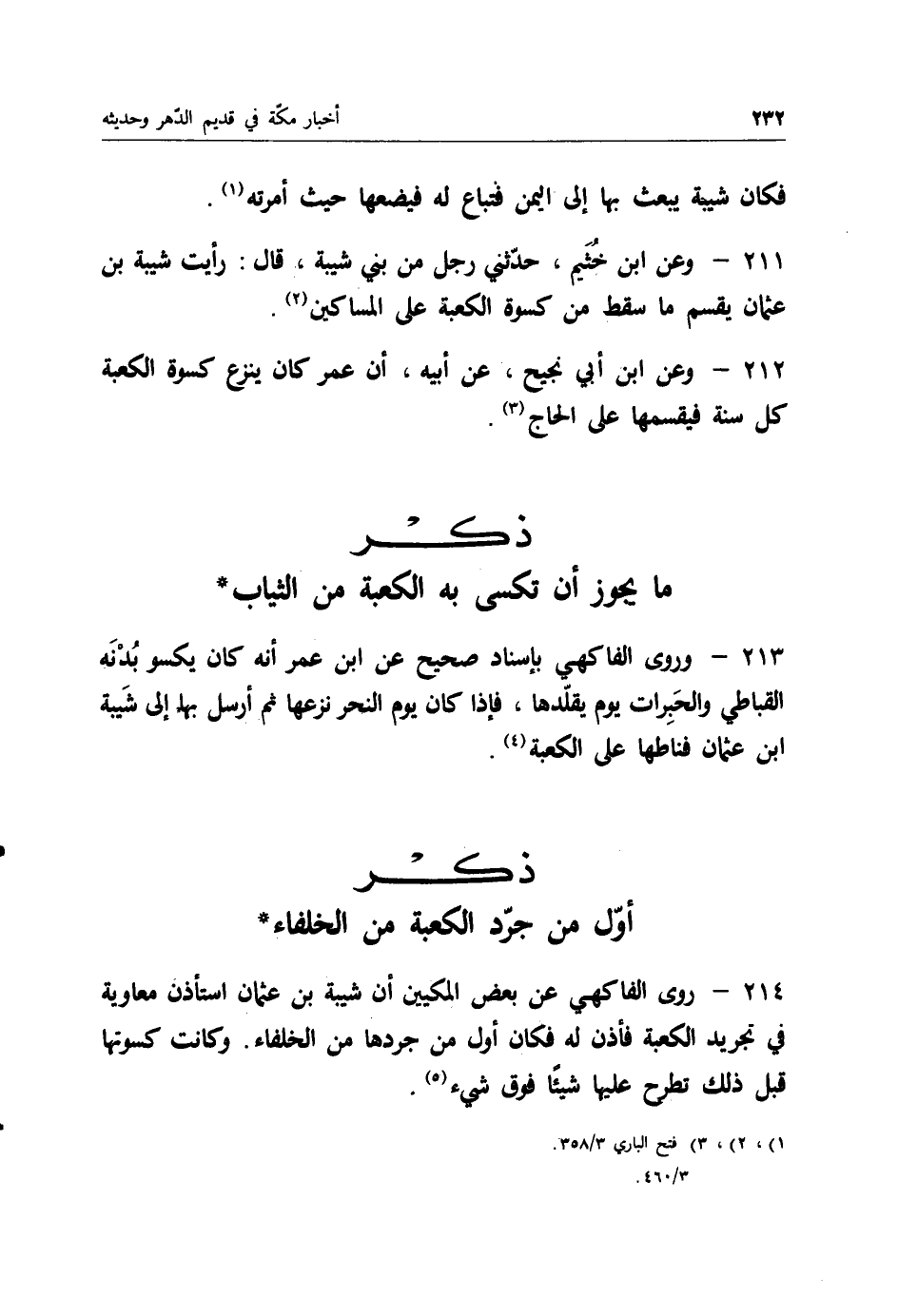 214 - روى الفاكهي عَن بعض المكيين أَن شيبَة بن عُثْمَان اسْتَأْذن مُعَاوِيَة فِي تَجْرِيد الْكَعْبَة فَأذن لَهُ فَكَانَ أول من جردها من الْخُلَفَاء وَكَانَت كسوتها قبل ذَلِك تطرح عَلَيْهَا شَيْئا فَوق شَيْء
