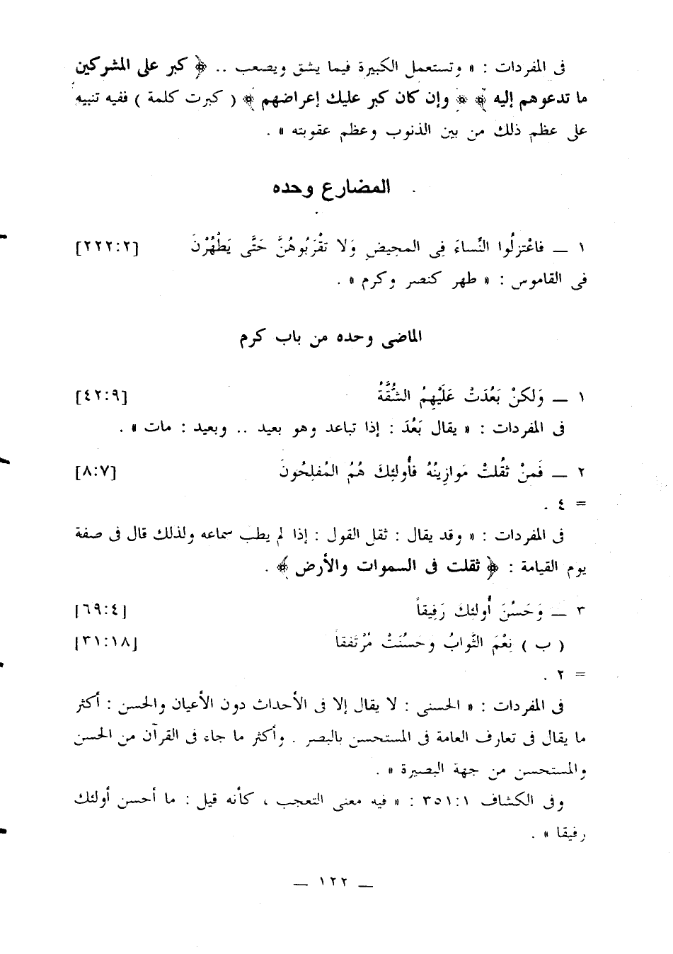 في المفردات: «وتستعمل الكبيرة فيما يشق ويصعب ... {كبر على المشركين ما تدعوهم إليه} {وإن كان كبر عليك إعراضهم} (كبرت كلمة) ففيه تنبيه على عظم ذلك من بين الذنوب وعظم عقوبته».