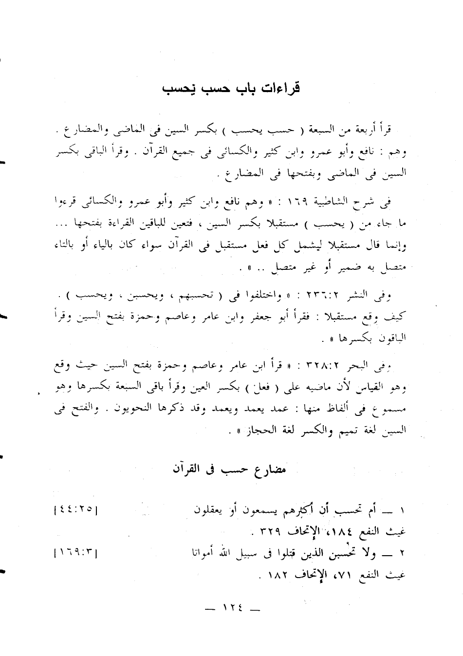 في شرح الشاطبية 169: «وهم نافع وابن كثير وأبو عمرو والكسائي قرءوا ما جاء من (يحسب) مستقبلا بكسر السين، فتعين للباقين القراءة بفتحها ... وإنما قال مستقبلا ليشمل كل فعل مستقبل في القرآن سواء كان بالياء أو بالتاء متصل به ضمير أو غير متصل ...».