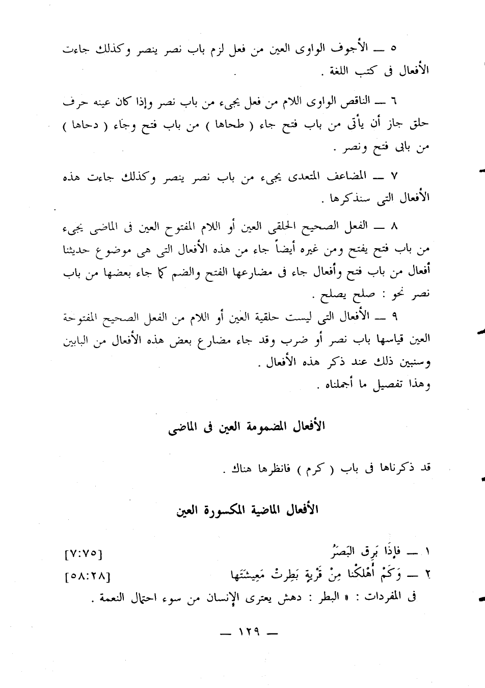 9 - الأفعال التي ليست حلقية العين أو اللام من الفعل الصحيح المفتوحة العين قياسها باب نصر أو ضرب وقد جاء مضارع بعض هذه الأفعال من الباين وسنبين ذلك عند ذكر هذه الأفعال.