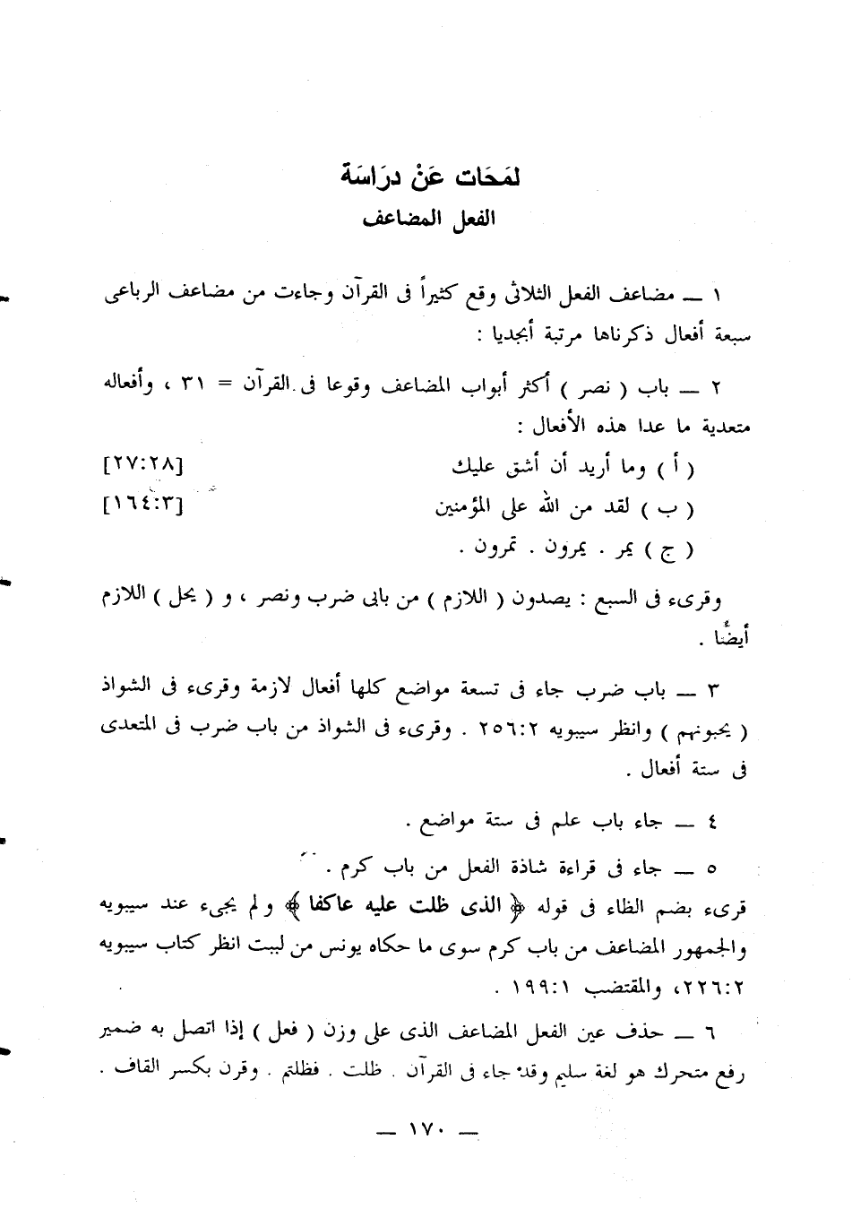 1 - مضاعف الفعل الثلاثي وقع كثيرًا في القرآن وجاءت من مضاعف الرباعي سبعة أفعال ذكرناها مرتبة أبجديًا.