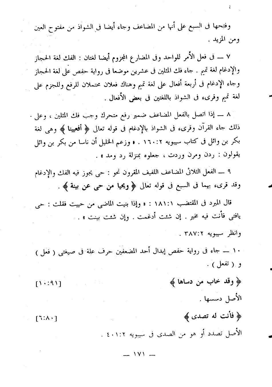 8 - إذا اتصل بالفعل المضاعف ضمير رفع متحرك وجب فك المثلين، وعلى ذلك جاء القرآن وقرئ في الشواذ بالإدغام في قوله تعالى {أفعيينا} وهي لغة بكر بن وائل في كتاب سيبويه 2: 160. «وزعم الخليل أن ناسا من بكر بن وائل يقولون: ردن ومرن وردت، جعلوه بمنزلة رد ومد».