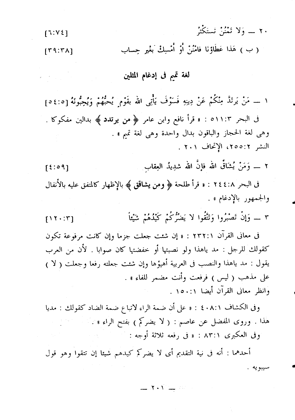 في البحر 8: 244: «قرأ طلحة {ومن يشاقق} بالإظهار كالمتفق عليه بالأنفال والجمهور بالإدغام».