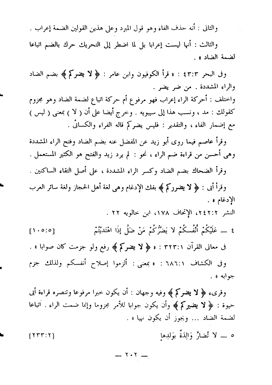 وفي البحر 3: 43: «قرأ الكوفيون وابن عامر: {لا يضركم} بضم الضاد والراء المشددة. من ضر يضر.