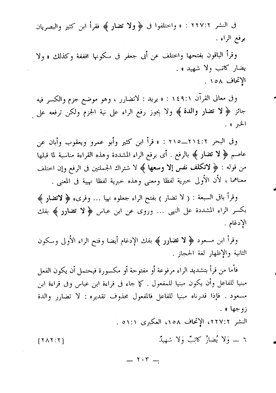 وفي البحر 2: 214 - 215: «قرأ ابن كثير وأبو عمرو ويعقوب وأبان عن عاصم {لا تضار} بالرفع. أي برفع الراء المشددة وهذه القراءة مناسبة لما قبلها من قوله: {ولا تكلف نفس إلا وسعها} لا شتراك الجملتين في الرفع وإن اختلف معناهما، لأن الأولى خبرية لفظا ومعنى وهذه خبرية لفظا نهيية في المعنى.
