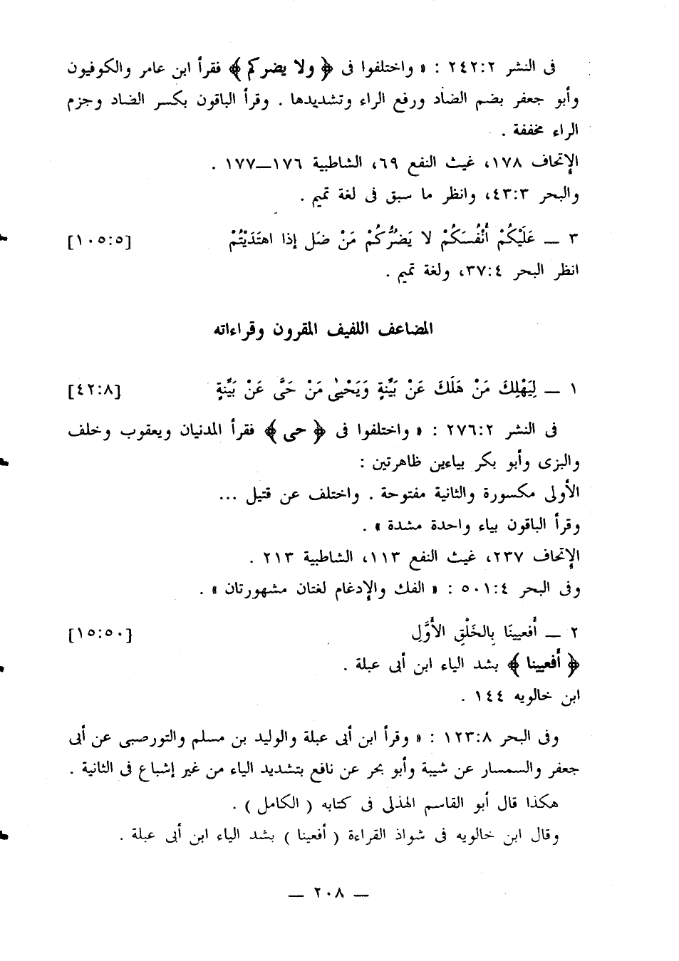 في النشر 2: 242: «واختلفوا في {ولا يضركم} فقرأ ابن عامر والكوفيون وأبو جعفر بضم الضاد ورفع الراء وتشديدها. وقرأ الباقون بكسر الضاد وجزم الراء مخففة.