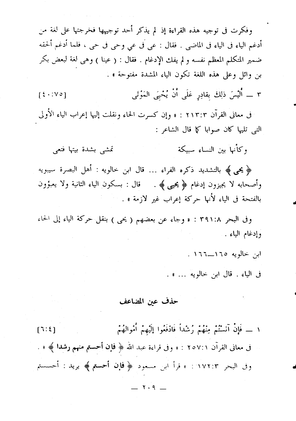 في معاني القرآن 3: 213: «وإن كسرت الحاء ونقلت إليها إعراب الياء الأولى التي تليها كان صوابا كما قال الشاعر: