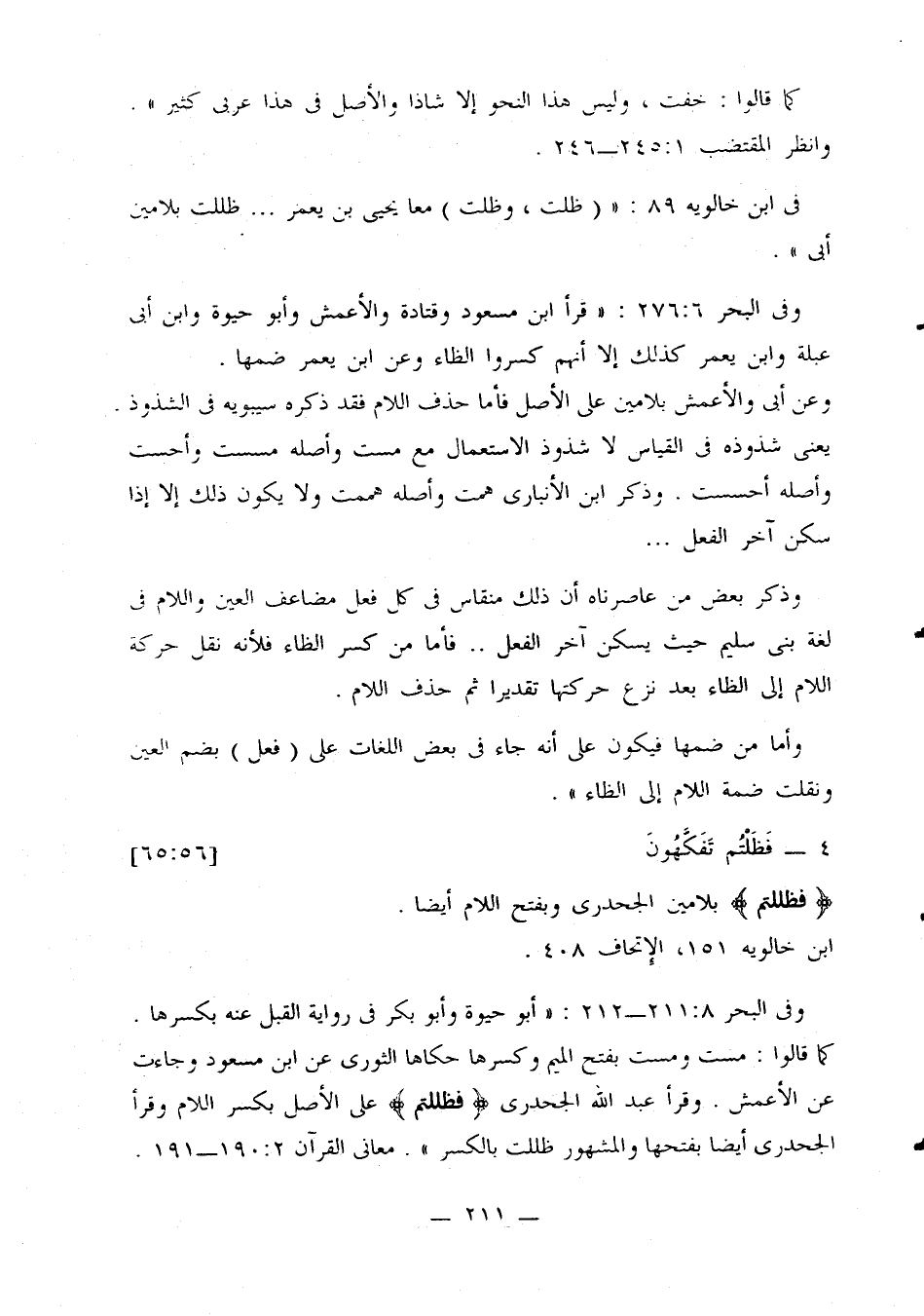 وفي البحر 8: 211 - 212: «أبو حيوة وأبو بكر في رواية القبل عنه بكسرها. كما قالوا: مست ومست بفتح الميم وكسرها حكاها الثوري عن ابن مسعود وجاءت عن الأعمش. وقرأ عبد الله الجحدري {فظللتم} على الأصل بكسر اللام وقرأ الجحدري أيضًا بفتحها والمشهور ظللت بالكسر». معاني القرآن 2: 190 - 191.