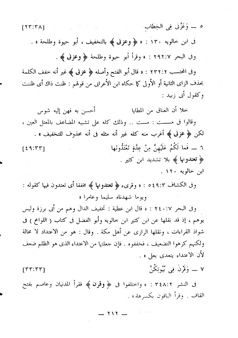 وفي البحر 7: 240: «قال ابن عطية: تخفيف الدال وهم من أبي برزة وليس يوهم، غذ قد نقلها عن ابن كثير ابن خالويه وأبو الفضل في كتاب (اللوامح) في شواذ القراءات، ونقلها الرازي عن أهل مكة. وقال: هو من الاعتداد لا محالة ولكنهم كرهوا التضعيف، فخففوه. فإن جعلتها من الاعتداء الذي هو الظلم ضعف لأن الاعتداء يتعدى بعلى».