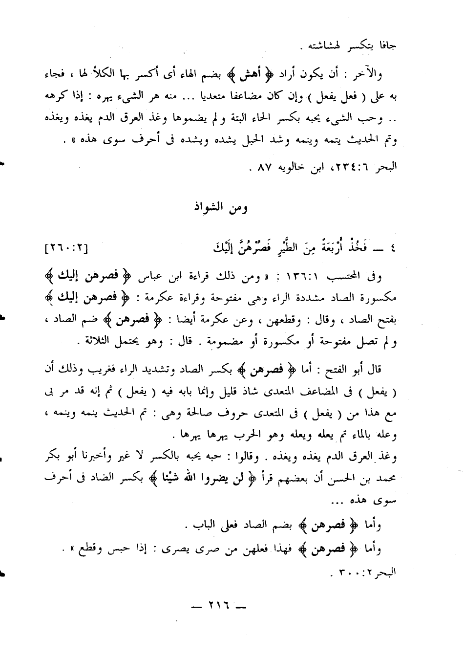 قال أبو الفتح: أما {فصرهن} بكسر الصاد وتشديد الراء فغريب وذلك أن (يفعل) في المضاعف المتعدى شاذ قليل وإنما بابه فيه (يفعل) ثم إنه قد مر بي مع هذا من (يفعل) في المتعدي حروف صالحة وهي: تم الحديث ينمه وينمه، وعله بالماء ثم يعله ويعله وهو الحرب يهرها يهرها.