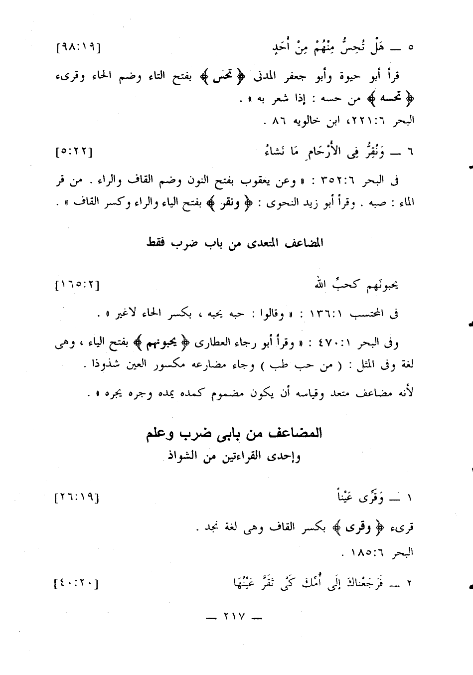 وفي البحر 1: 470: «وقرأ أبو رجاء العطاري {يحبونهم} بفتح الياء، وهي لغة وفي المثل: (من حب طب) وجاء مضارعه مكسور العين شذوذا.