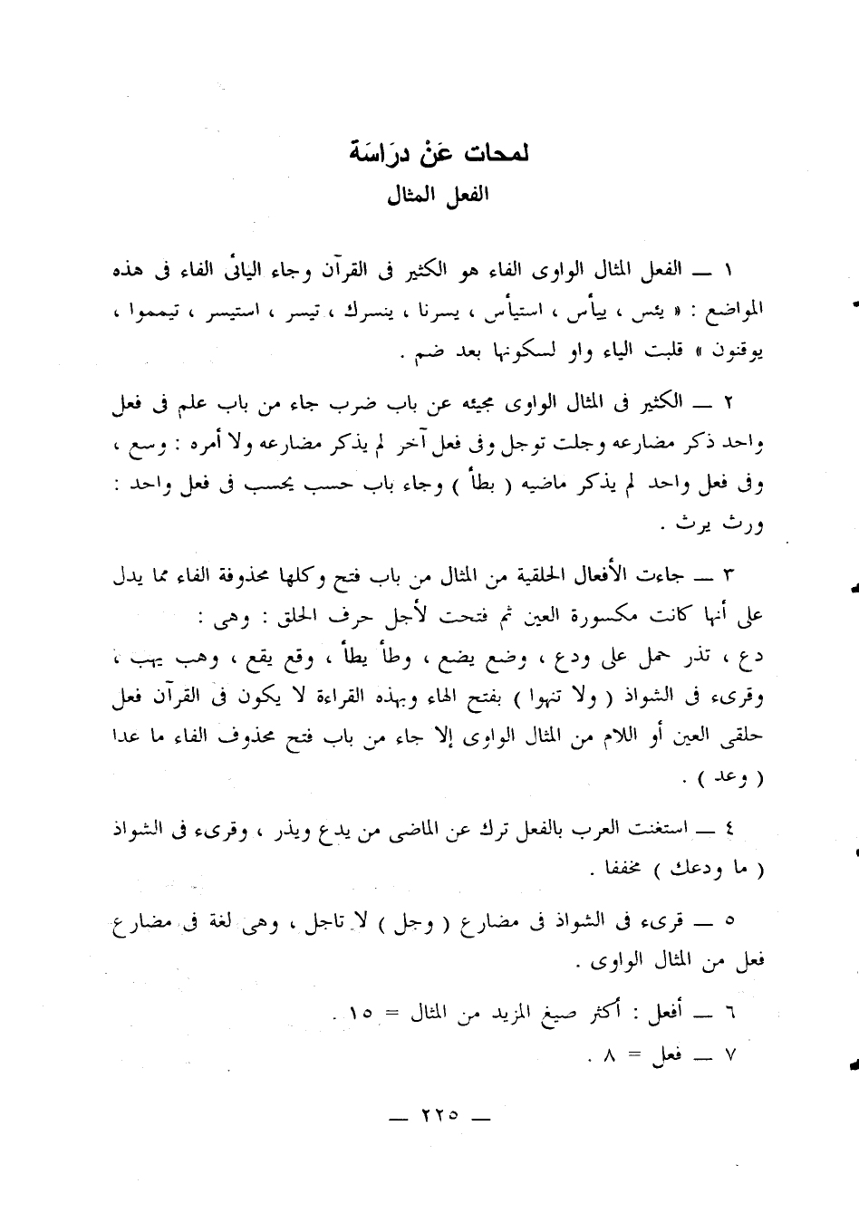 1 - الفعل المثال الواوي الفاء هو الكثير في القرآن وجاء اليائي الفاء في هذه المواضع: «يئس، ييأس، استيأس، يسرنا، ينسرك، تيسر، استيسر، تيمموا، يوقنون». قلبت الياء واو لسكونها بعد ضم.
