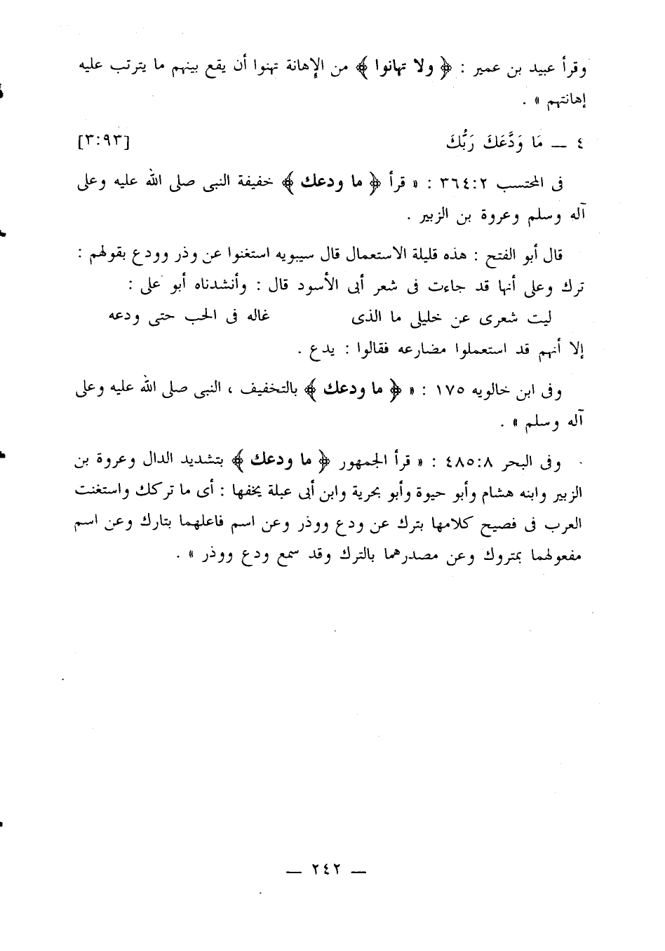 وفي البحر 8: 485: «قرأ الجمهور {ما ودعك} بتشديد الدال وعروة بن الزبير وابنه هشام وأبو حيوة وأبو بحرية وابن أبي عبلة يخفها: أي ما تركك واستغنت العرب في فصيح كلامها بترك عن ودع ووذر وعن اسم فاعلهما بتارك وعن اسم مفعولهما بمتروك وعن مصدرهما بالترك وقد سمع ودع ووذر».