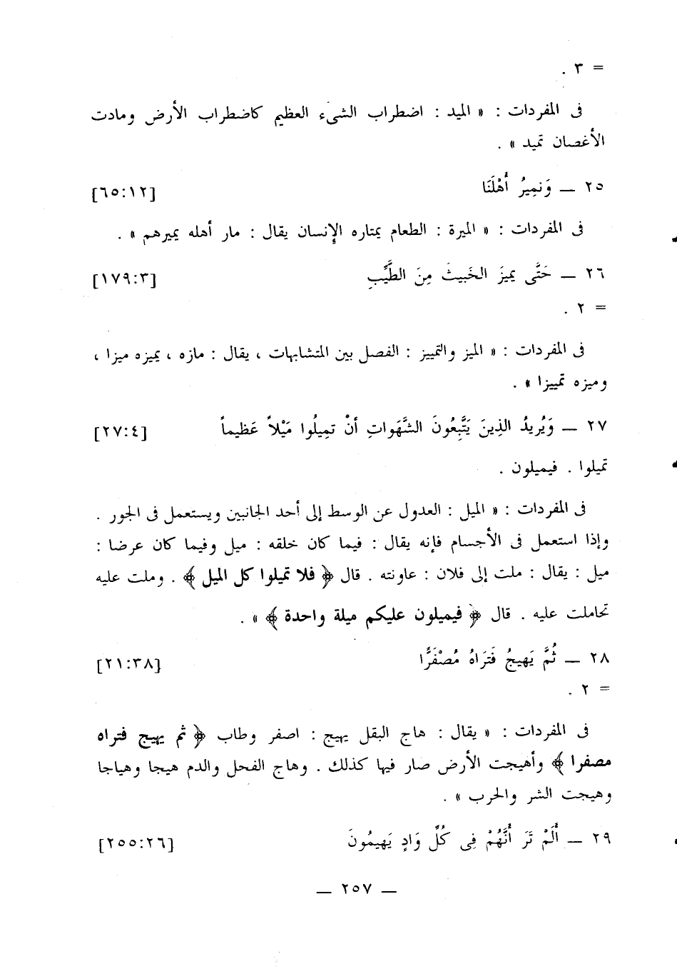 في المفردات: «الميل: العدول عن الوسط إلى أحد الجانبين ويستعمل في الجور. وإذا استعمل في الأجسام فإنه يقال: فيما كان خلقه: ميل وفيما كان عرضا: ميل: يقال: ملت إلى فلان: عاونته. قال {فلا تميلوا كل الميل}. وملت عليه تحاملت عليه. قال {فيميلون عليكم ميلة واحدة}».