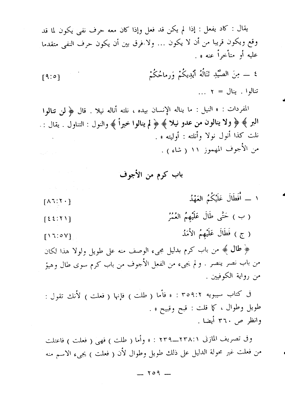 {طال} من باب كرم بدليل مجيء الوصف منه على طويل ولولا هذا لكان من باب نصر ينصر. ولم يجيء من الفعل الأجوف من باب كرم سوى طال وهيؤ من رواية الكوفيين.