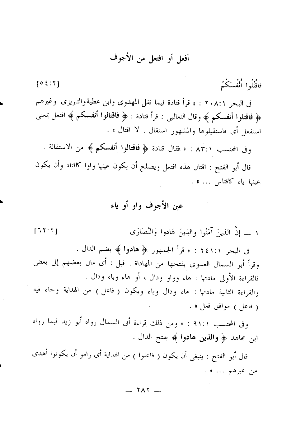 في البحر 1: 208: «قرأ قتادة فيما نقل المهدوي وابن عطية والتبريزي وغيرهم {فاقتلوا أنفسكم} وقال الثعالبي: قرأ قتادة: {فاقتالوا أنفسكم} افتعل بمعنى استفعل أي فاستقيلوها والمشهور استقال. لا اقتال».