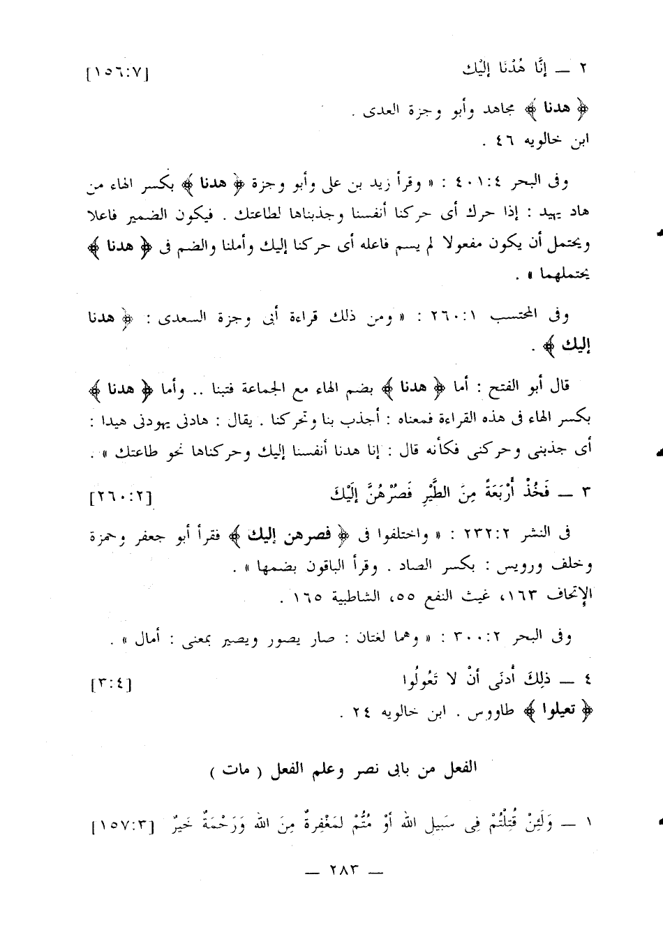 في النشر 2: 232: «واختلفوا في {فصرهن إليك} فقرأ أبو جعفر وحمزة وخلف ورويس: بسكر الصاد. وقرأ الباقون بضمها».