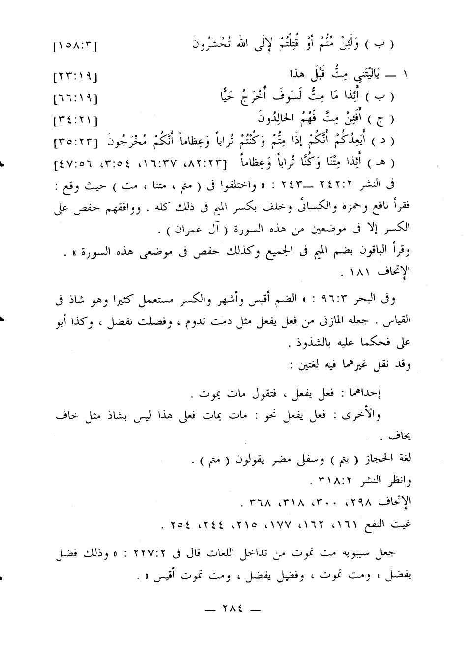 في النشر 2: 242 - 243: «واختلفوا في (متم، متنا، مت) حيث وقع: فقرأ نافع وحمزة والكسائي وخلف بكسر الميم في ذلك كله. ووافقهم حفص على الكسر إلا في موضعين من هذه السورة (آل عمران).
