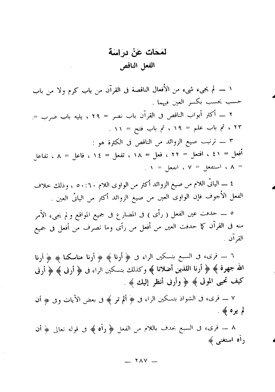 1 - لم يجيء شيء من الأفعال الناقصة في القرآن من باب كرم ولا من باب حسب يحسب بكسر العين فيهما.