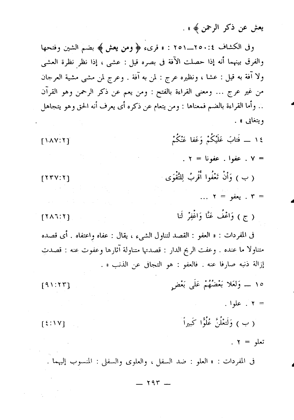وفي الكشاف 4: 250 - 251: «قرئ {ومن يعش} بضم الشين وفتحها والفرق بينهما أنه إذا حصلت الآفة في بصره قيل: عشى، إذا نظر نظرة العشى ولا آفة به قيل: عشا، ونظيره عرج: لمن به آفة. وعرج لمن مشى مشية العرجان من غير عرج ... ومعنى القراءة بالفتح: ومن يعم عن ذكر الرحمن وهو القرآن ... وأما القراءة بالضم فمعناها: ومن يتعام عن ذكره أي يعرف أنه الحق وهو يتجاهل ويتغابى».